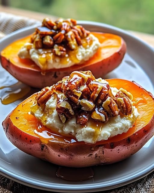 🍠 Patates Douces Garnies au Fromage Cottage, Noix de Pécan et Sirop d’Érable