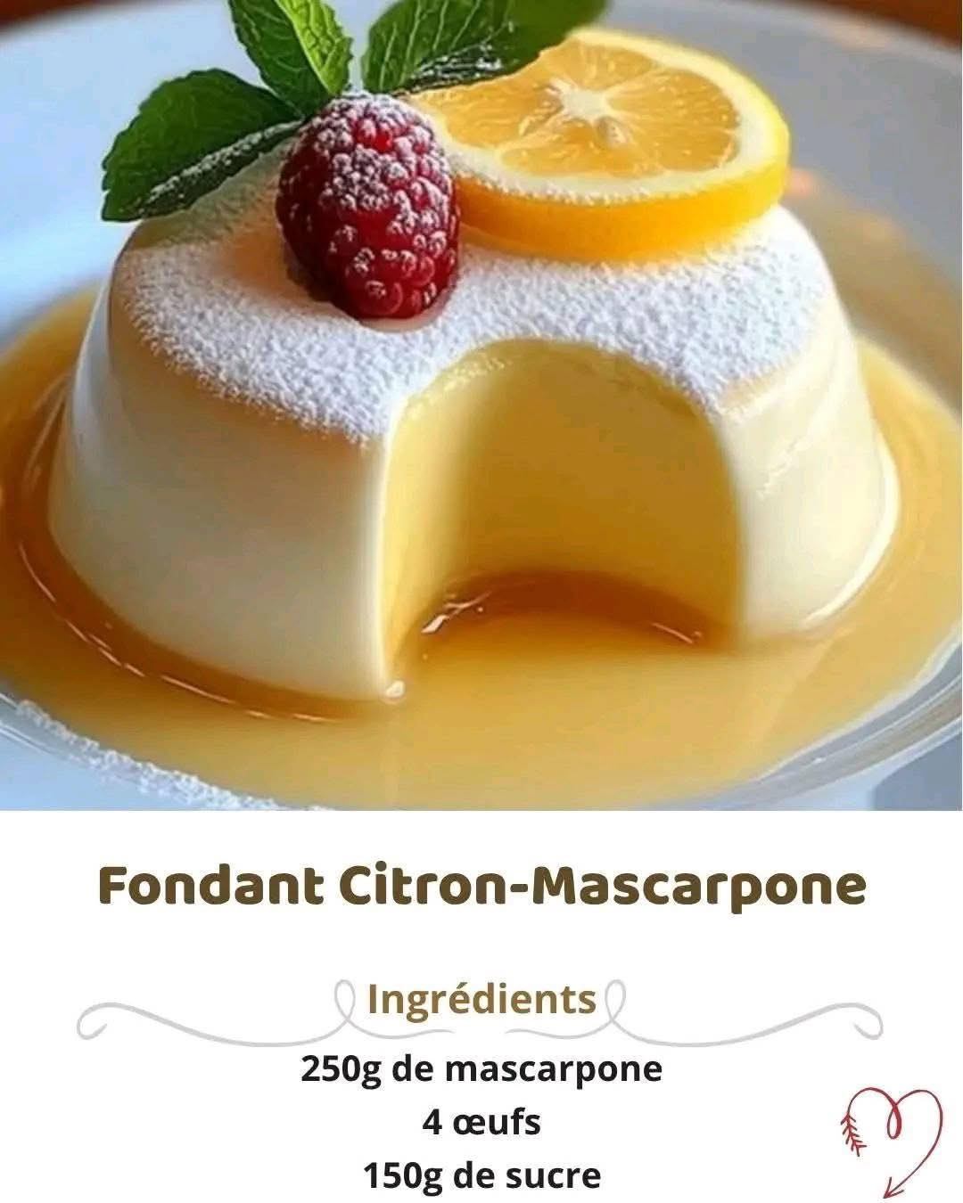 Ce fondant citron-mascarpone est un délice à la fois frais et crémeux, parfait pour terminer un repas sur une note sucrée et acidulée. La combinaison du mascarpone et du citron apporte une légèreté irrésistible.