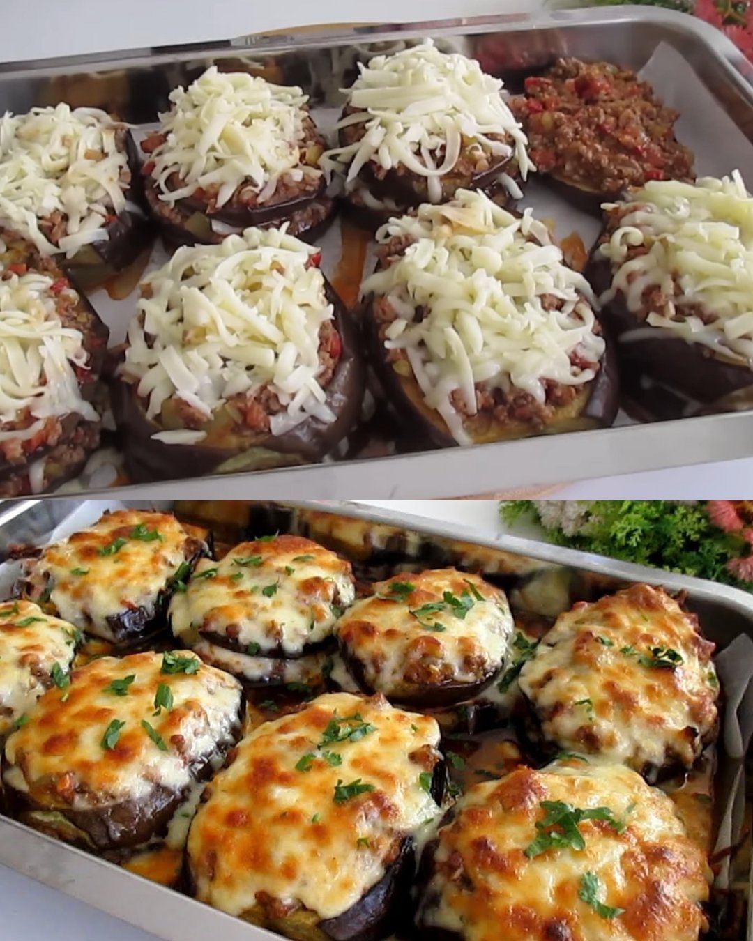 Ingrédients : 4 aubergines (environ 1 300 grammes) 50 ml d’huile d’olive Poivre moulu Sel Pour la garniture : 500 grammes de bœuf haché 3 tomates 1 poivron rouge 4 poivrons verts 1 oignon 4 gousses d’ail 1 cuillère à café de concentré de tomates (environ 25 grammes) 4-5 cuillères à soupe d’huile végétale (environ 40 ml) 1 verre d’eau (environ 200 ml) Paprika, poivre noir, cumin, thym et sel (au goût) … Lire plus