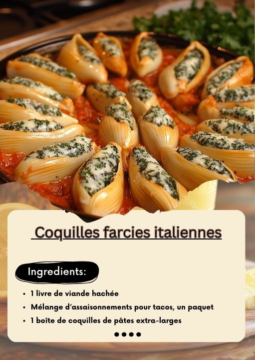 Rendement : 4 à 6 portionsEn cuisine : italien et mexicainIneskohl Kitchen en est l’auteur.Une demi-heure pour la préparationCe dont vous avez besoin :1 livre de viande hachéeMélange d’assaisonnements pour tacos, un paquet1 boîte de coquilles de pâtes extra-largesRincez et égouttez une boîte de haricots noirs.Grains de maïs, mesurant une tasseFromage cheddar haché, mesurant 1 … Lire plus